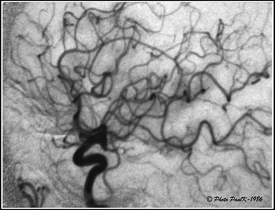 Sur le cliché de droite, correspondant à une artériographie carotidienne, on ne voit pratiquement plus la structure de la boite crânienne ce qui permet d’obtenir une très bonne lisibilité du système artériel et veineux.
