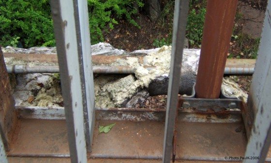 Autour de ces canalisations, à ciel ouvert, les enveloppes éventrées laissent échapper leurs calorifugeages d’amiante, bourrés de poussières assassines.