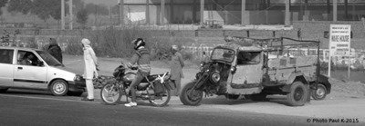 Le chauffeur de car, homme calme à l’allure d’un sherpa népalais sera notre homme de confiance. Et nous en aurons souvent besoin de sa confiance, tant les habitudes de conduites ici sont éloignées de celles de notre pays. Conduite à gauche bien sûr, héritage britannique oblige, mais aussi routes étroites, mal entretenues. Quant au code de la route, il semble ne pas être la première des préoccupations des conducteurs, ni des piétons indiens. L’essentiel étant de passer, en se faufilant dans les embouteillages, en surfant entre les animaux, les véhicules venus d’une autre planète, le tout dans un concert de klaxonnes bruyants et peu mélodieux.