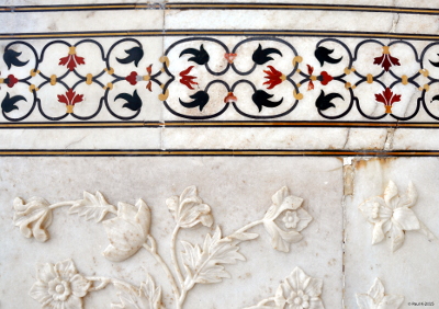 (pietra dura) dont nous avons vu lors d’un précédent billet le travail des artisans indiens, constitue, avec les sculptures et autres motifs ciselées, le cœur des décors de ce monument.
