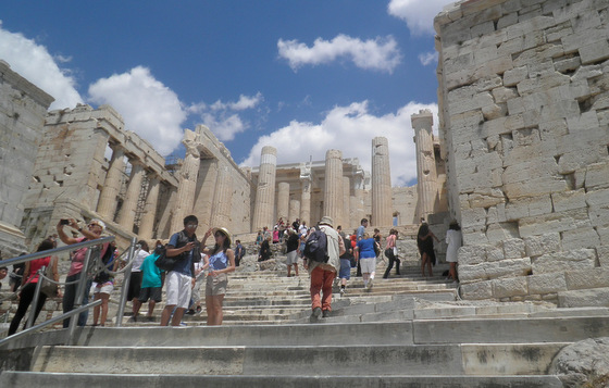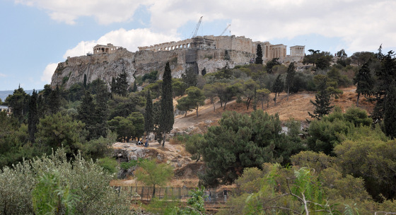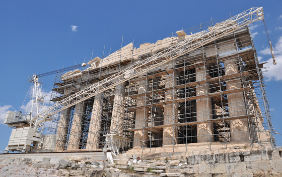 L’Acropole, point d’entrée obligé sur la colline d’Athènes surplombant la ville est un vaste chantier où il semble bien que le patrimoine, pour sa conservation, subit lui aussi les affres de la crise financière.