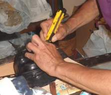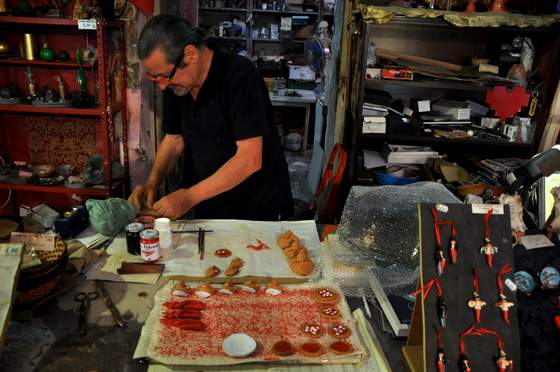 Masque Pulcinella (1)Bien sûr le quartier ne manque pas de boutiques vendant des masques de toutes sortes en terre cuite, en carton ou en plastique venus d’Asie, rien d’authentique donc, pour cet art créatif dont la fabrique en cuir, aujourd’hui, est devenue denrée rare.