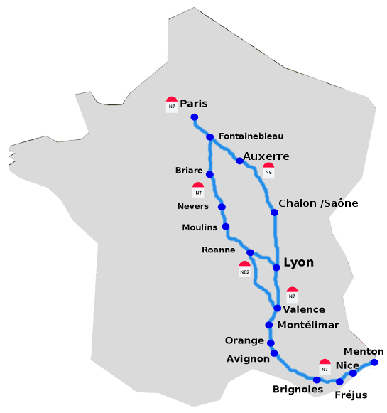 Deux options se présentent entre Fontainebleau et Lyon, N6 ou N7. Nous resterons pour notre part sur la N7. Deux autres options entre Roanne et Valence où pour contourner Lyon, la N7 devient un temps la N82, aussi appelée « la Route Bleue ».