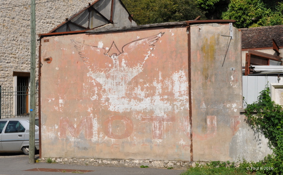 A l’entrée de Saint Pierre-lès-Nemours, sur un pignon de maison, une fresque murale particulièrement bien entretenue retient mon attention. Il paraitrait que cette maison est l’objet de convoitises de la part des afficionados de la 7, car cette peinture murale reste l’une des plus anciennes réclames visible sur la Nationale 7.