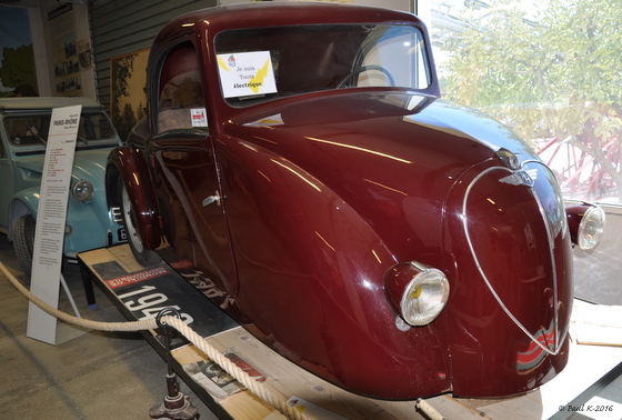 Si le premier prototype de voiture électrique date de 1834, ce modèle fut construit en 1942 par la Sté Paris Rhône de Lyon (Caractéristiques : vitesse 30 km/h , autonomie 60 km)