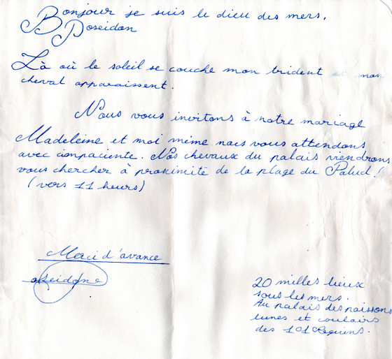 Farce d’adolescent ou vrai message posté par des jeunes mariés ? Je ne le saurais jamais. Encore un de ces mystères auxquels la petite plage St Julien m’aura habitué. La ville d’Ys n’est pas loin, avec elle tous mes souvenirs de lectures d’enfance, s’entrelacent avec les récits de mes ainés. La mer a tellement de secrets.
