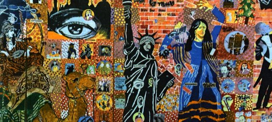 A l’image d’un patchwork ou d’une mosaïque byzantine, ses peintures seront assemblées au fil du temps pour former une fresque narrative de plusieurs mètres de long.
