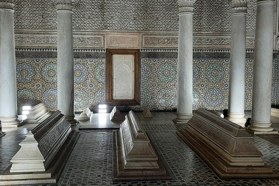 A quelques encablures, les tombeaux saadiens. Ce jardin cimetière, qui fait partie de la mosquée El-Mansour a été récupéré au XVIè siècle par les Saadiens.