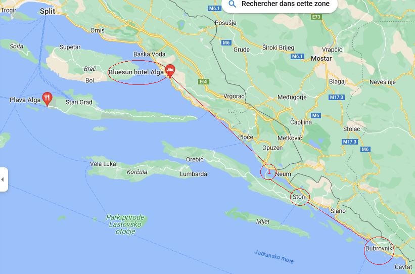 Après cette pause introductive, entrons dans le vif du sujet. Nous sommes le 12 avril 2023, direction Dubrovnik, Ston où nous déjeunerons, puis nous longerons la côte adriatique pour emprunter le pont de Peljesac (1) en direction de Alga Hotel Bluesun où nous passerons la nuit.
