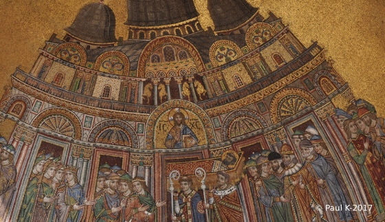 Les premiers vitraux de la cathédrale San Marco ont été réalisés par les artisans verriers suivant des procédés industriels jalousement gardés. Bien que la fabrication du verre translucide était connue depuis l’antiquité, l’apparition du verre à vitre est datée de l’époque Romaine. Les vestiges d’ Herculanum et Pompéi en ont laissé le témoignage. L’industrie verrière de Murano remonte au XIIIème siècle. Bien plus tard, ce sera paraît-il à Colbert que l’on doit la galerie des glaces de Versailles, après avoir fait espionner les maîtres verriers Vénitiens pour en rapporter les secrets de fabrication.