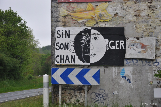 Empruntant régulièrement cette longue ligne droite qui me mène dans le Cap Sizun, je m’étais habitué à ces rendez-vous poétiques au point d’en collectionner les images éphémères et d’en devenir accro. Périodiquement donc, un(e) artiste qui ne m’est plus tout à fait inconnu(e) colle, dans l’indifférence supposée des automobilistes pressés, ses œuvres éphémères sur le pignon d’une masure abandonnée, redonnant pour quelques heures à ce bistrot délabré une présence mystérieuse et insolite.