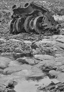 que la mer nature est parfois violente et cruelle. La force des vagues s’illustre ici par des fragments de moteurs d’épaves chahutées du plus profond des abîmes et venus s’échouer ici à deux pas du Guéveur.
