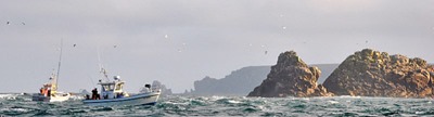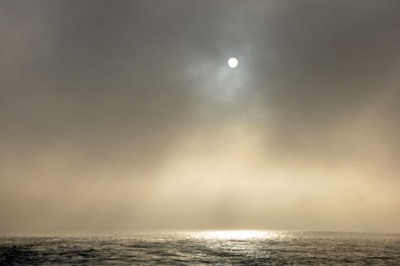 La traversée en ce matin d’automne 2012 se fera dans le brouillard. Le soleil s’est levé il y a peu et donne à la mer des reflets fantomatiques dignes des ambiances décrites par Anatole le Braz dans « Un voyage à l’île de Sein ».