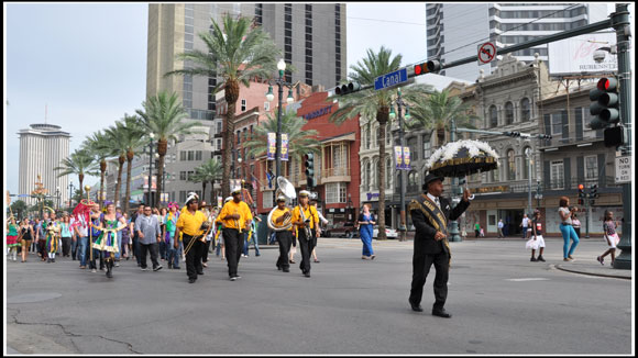 A son signal, les spectateurs situés de part et d’autre du cortège peuvent à leur tour participer au cortège, c’est la Second Line Parade.
